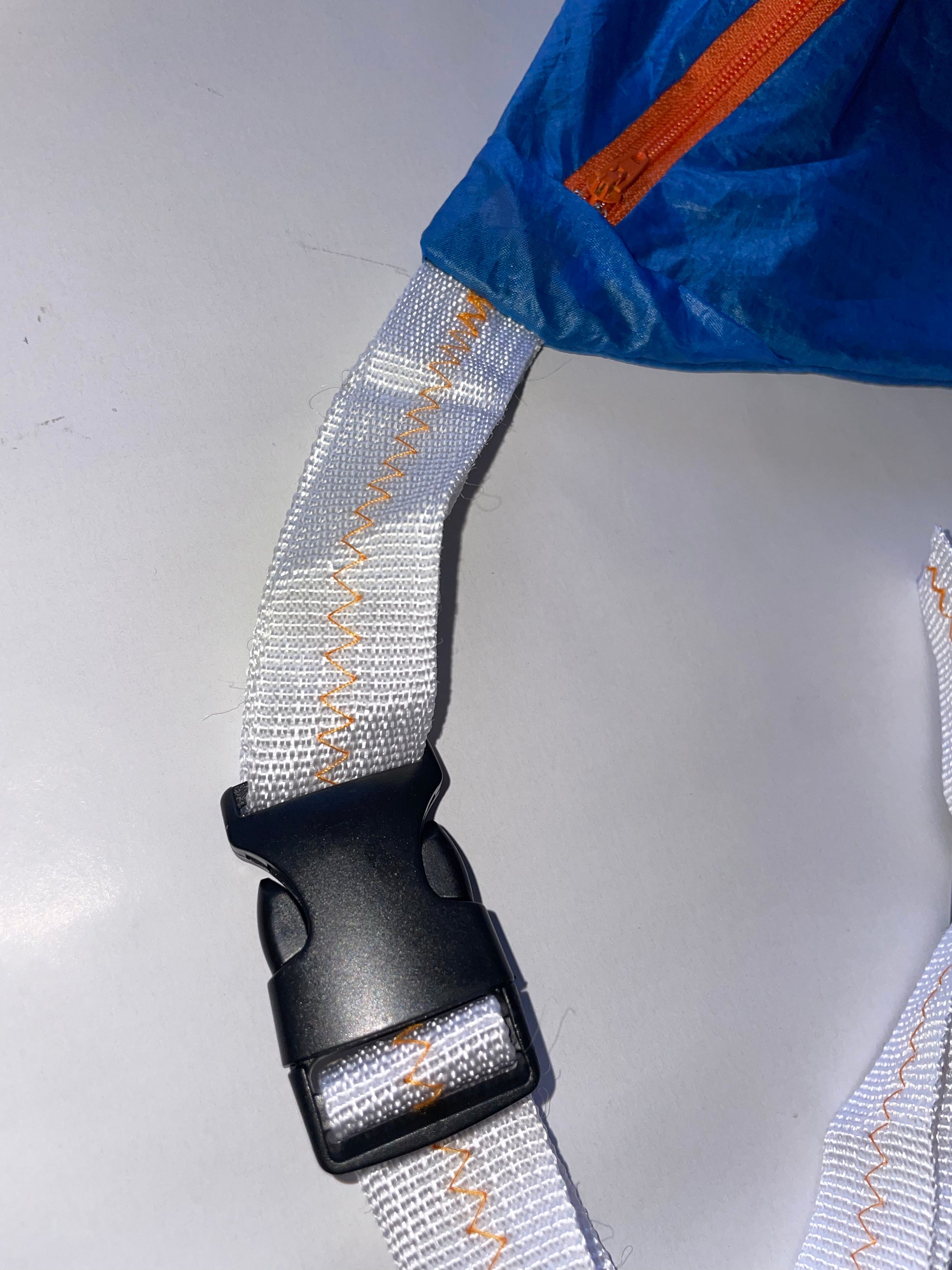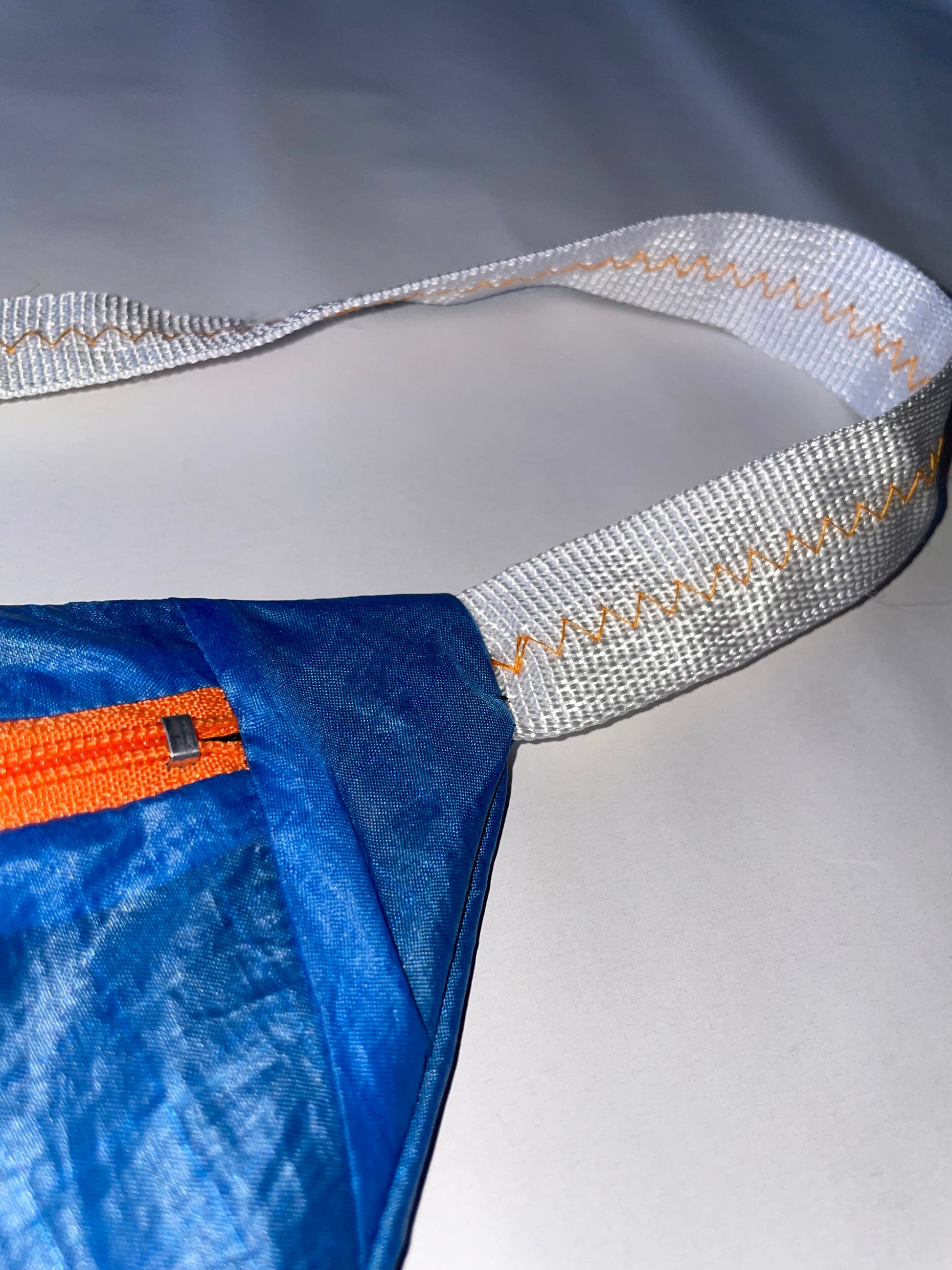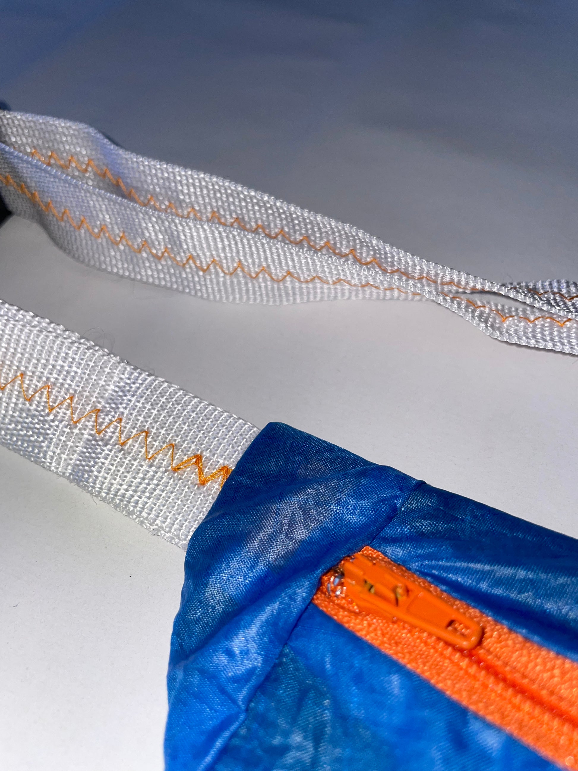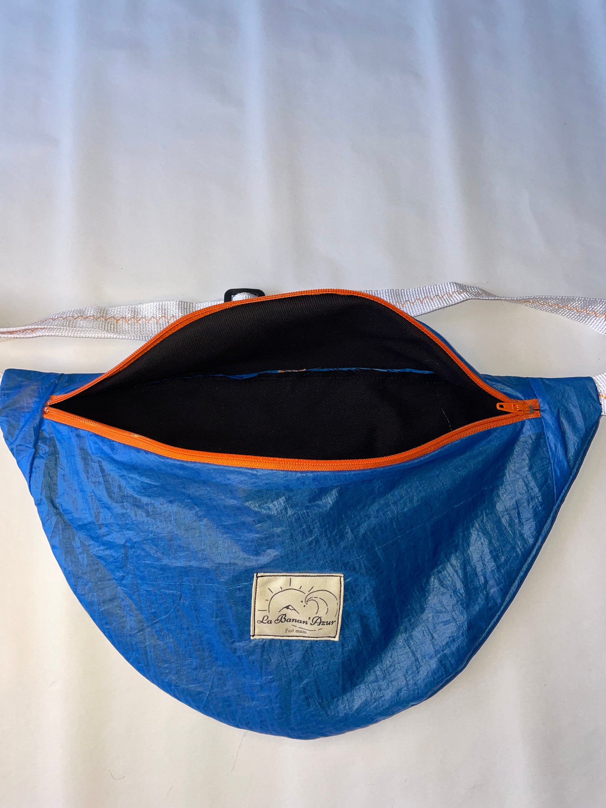 Cette banane est confectionnée à la main à partir d’un véritable spi de 420 recyclé. Son tissu bleu intense est sublimé par une fermeture éclair orange et des détails orange au dos, pour une touche vive et authentique.