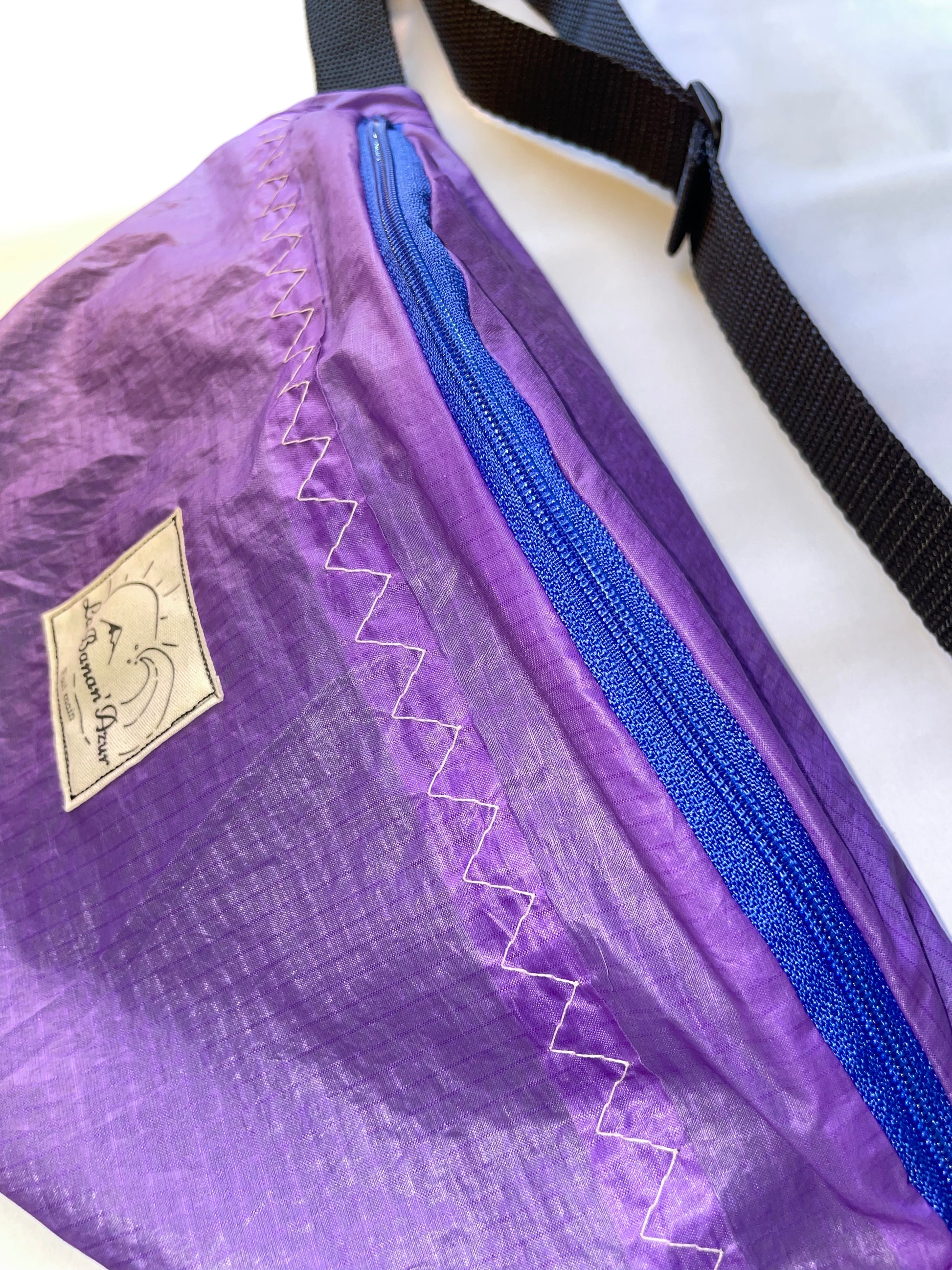 Ajoutez une touche de couleur et de caractère à vos accessoires avec cette banane violette unique, fabriquée à partir du spi d'un Hobie Cat 16 recyclé. Son tissu violet vibrant est sublimé par une fermeture bleue qui apporte une note de contraste dynamique, créant un accessoire aussi audacieux que pratique.